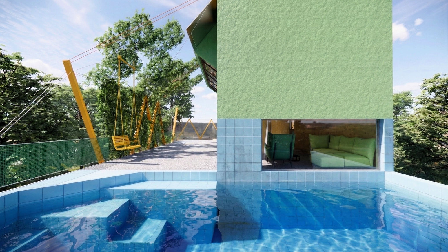 This contemporary home stands out for its stepped geometry and striking pistachio-green finish. It features a minimalist, integrated swimming pool and multiple levels of terraces with glass railings. The architecture maximizes the outdoor space with expansive windows and relaxation areas that connect with nature. The project incorporates solar panels at the rear, demonstrating a commitment to energy efficiency and sustainability. It is surrounded by lush vegetation that ensures privacy and a cool, modern environment.